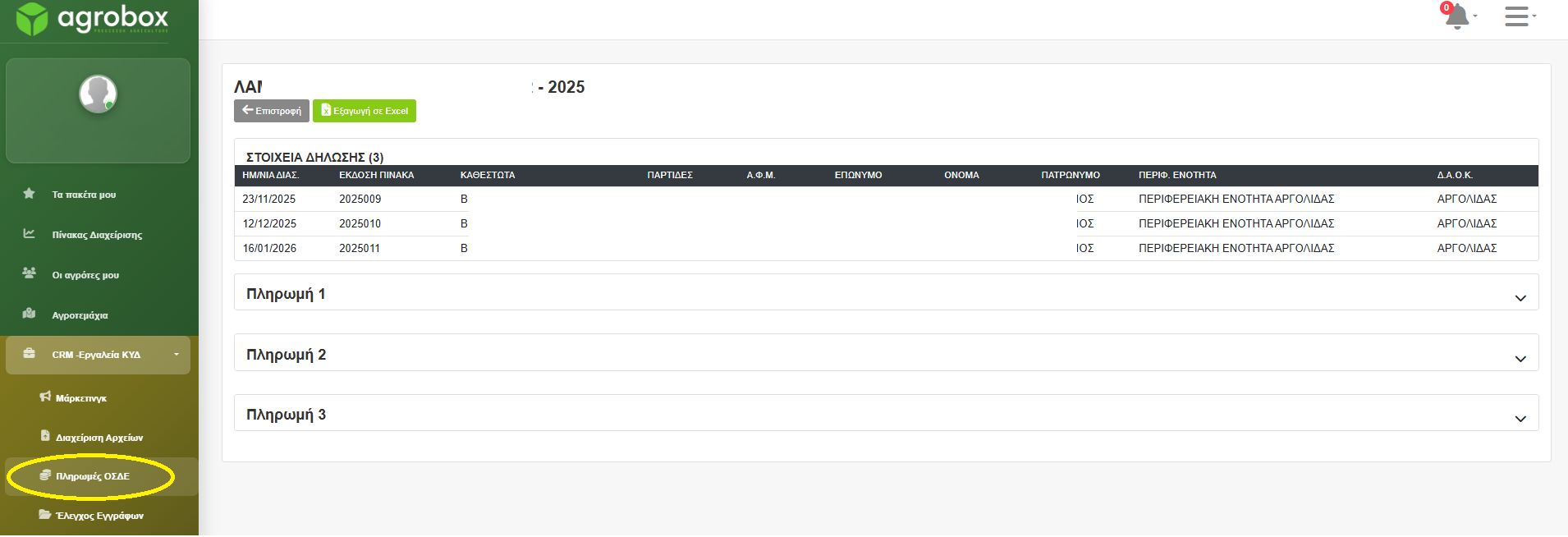 Συγκεκριμένα, σε εναρμόνιση με τις απαιτήσεις της εκάστοτε ΔΑΟΚ, ένας διαχειριστής μπορεί να εξάγει άμεσα και αποτελεσματικά τον ψηφιακό φάκελο ελαιοκομικού μητρώου για το σύνολο των παραγωγών του, ο οποίος περιλαμβάνει: