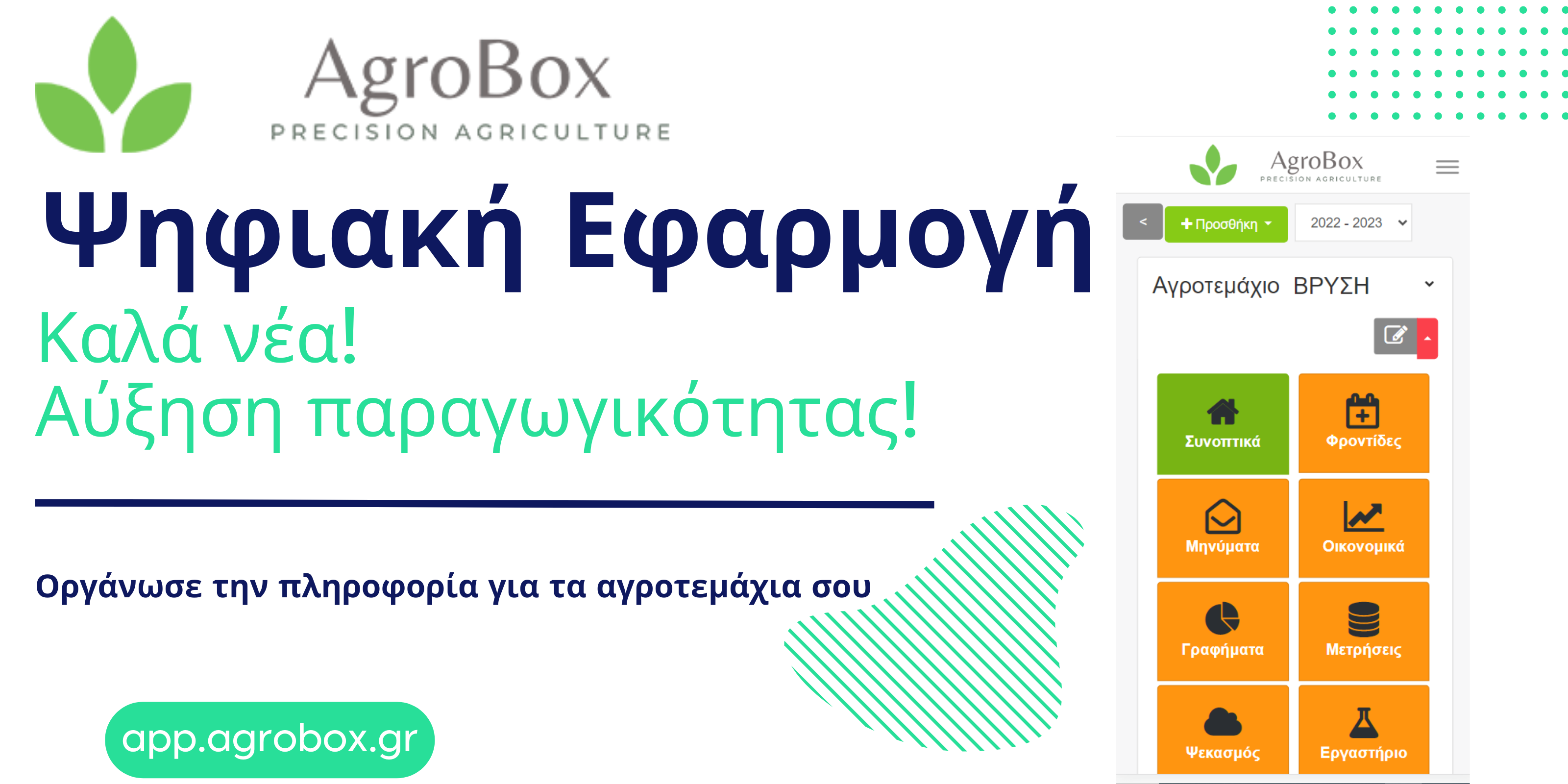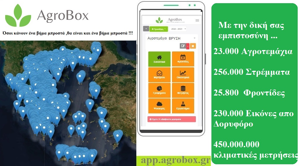 Το Agrobox βοηθά τους αγρότες, γεωπόνους και συμβούλους να γίνουν πιο δυναμικοί, πιο εξελιγμένοι, πιο αποτελεσματικοί.