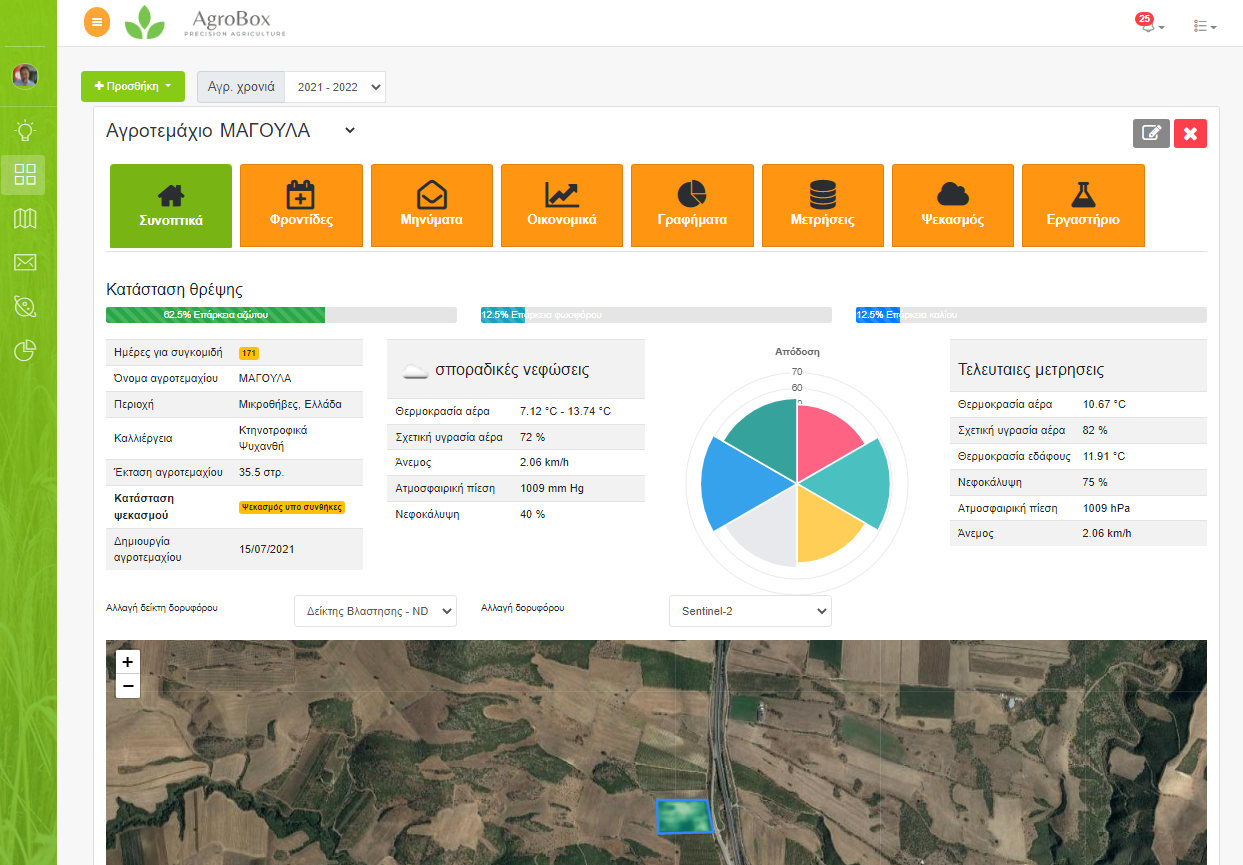 Ο αγρότης σχεδιάζει τα αγροτεμάχια του και αποκτά ένα ηλεκτρονικό αρχείο με δορυφορικές εικόνες, κλιματικά δεδομένα από μετεωρολογικούς σταθμούς, πληροφορίες πρόγνωσης καιρού, ειδοποιήσεις για το αν είναι επιτρεπτός ο ψεκασμός στο χωράφι του