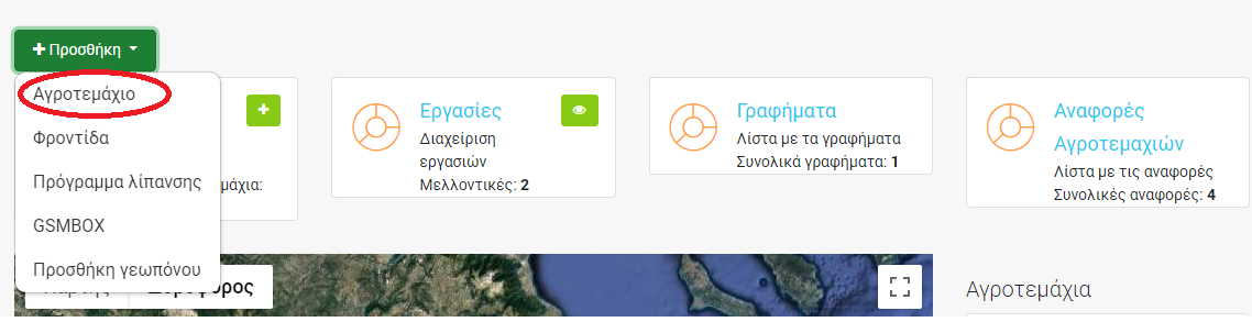 Βήμα 1 Από τον πίνακα διαχείρισης επιλέγουμε Προσθήκη-->Αγροτεμάχιο