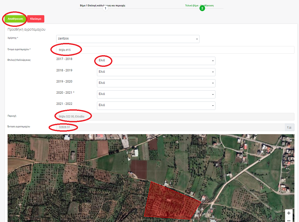 Βήμα 4 Στην συνέχεια επιλέγουμε το όνομα του αγροτεμαχίου, τις καλλιέργειες που είχαμε τα προηγούμενα χρόνια η περιοχή καθώς και η έκταση του αγροτεμαχίου. Στην συνέχεια πατάμε αποθήκευση.